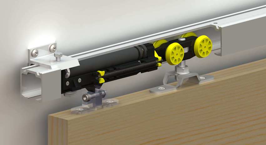 Направляющие используются не только для того, чтобы поддерживать роликовые каретки. Верхняя планка, имея пазы П-образной формы, куда заводится верхний край створки, исключает колебание дверей при их перемещении. На верхний рельс нагрузка преимущественно отсутствует. Нижняя направляющая со скругленным рельефом, которая воспринимает основную нагрузку от дверей, предназначена для перемещения створок.