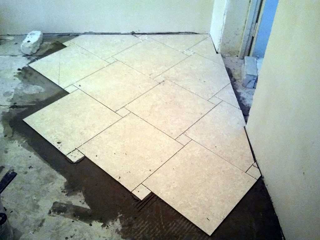 Расположение плитки по диагонали займет большее количество времени, из-за подрезания элементов, а также увеличит ее расход.