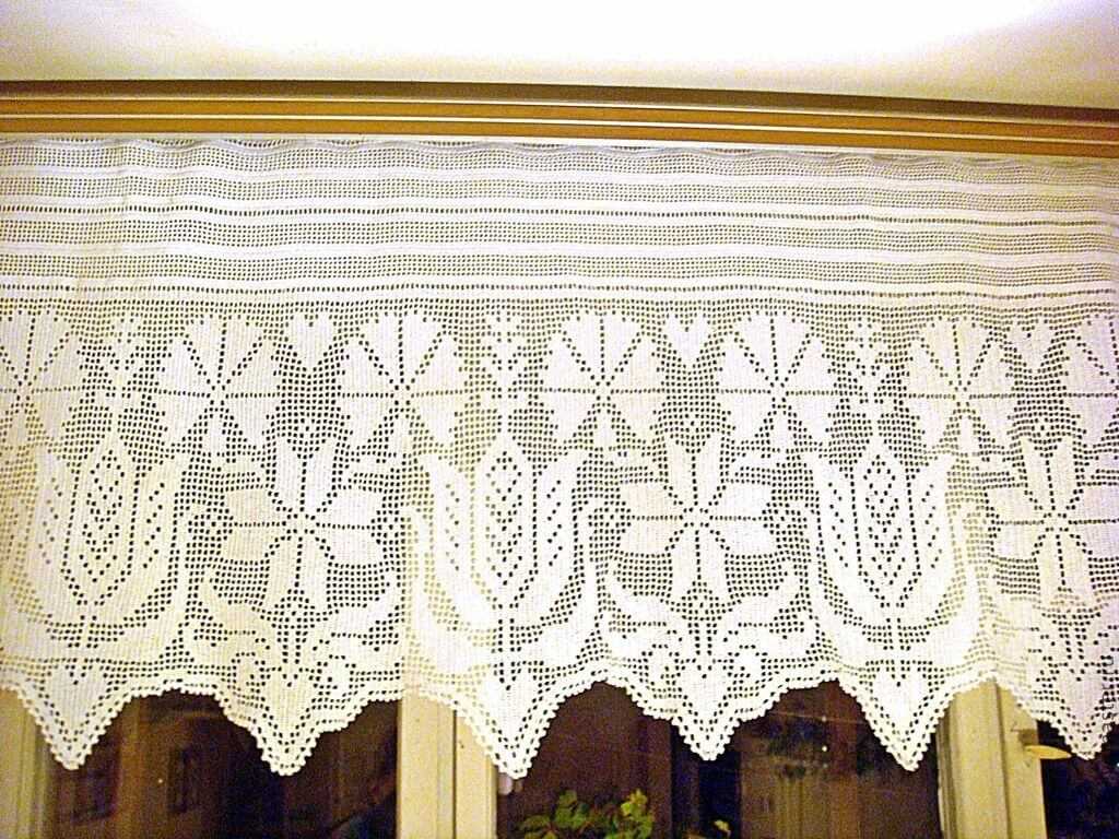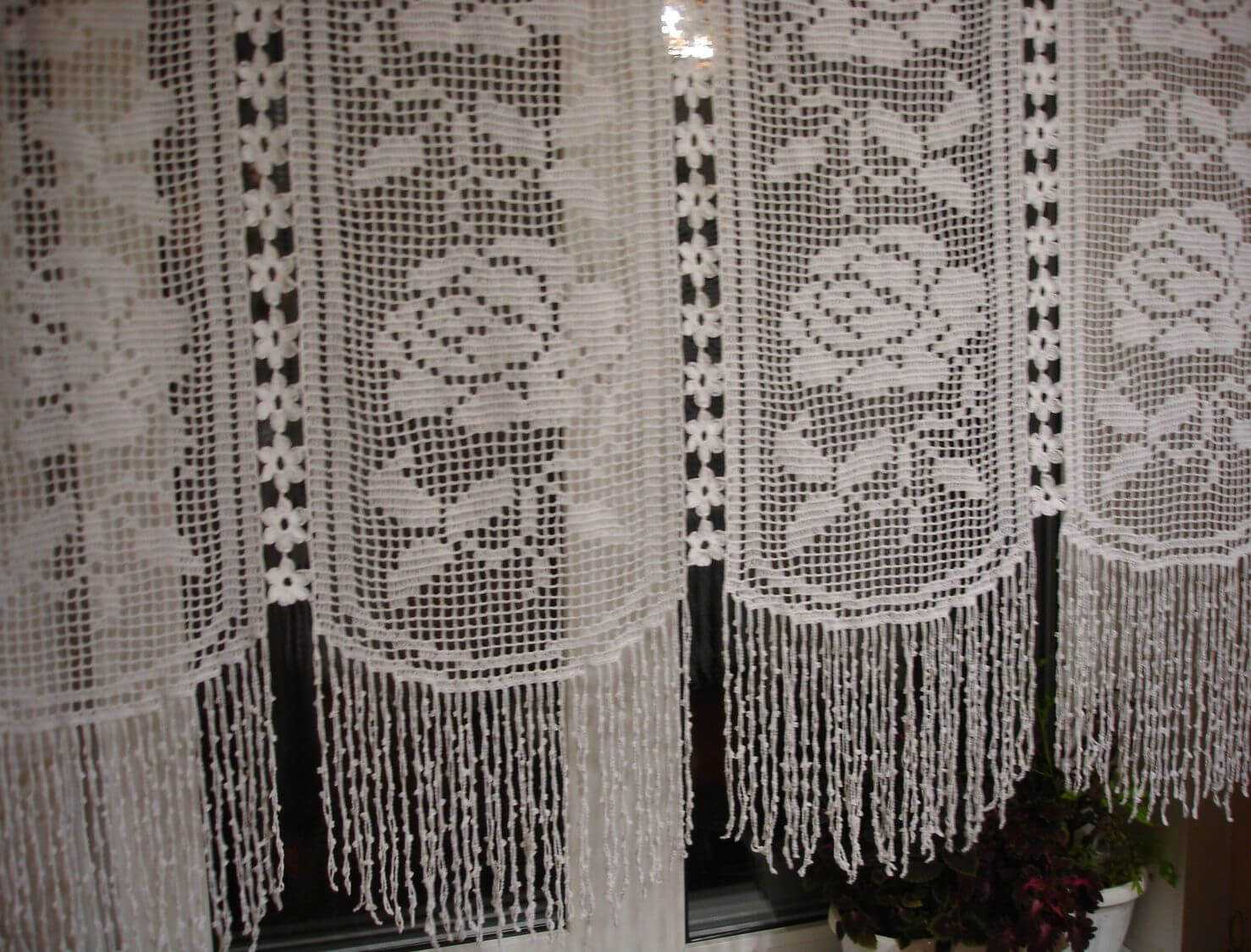 Ламбрекены и шторы-кафе, связанные крючком в технике брюгге.