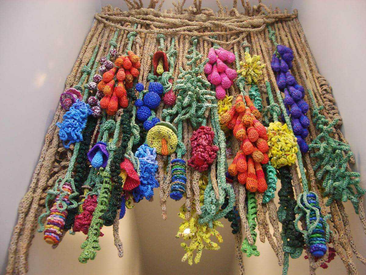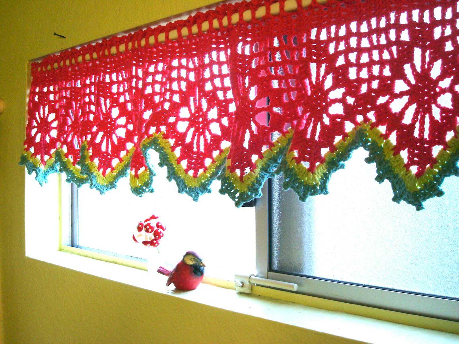 А вот как можно своими руками связать оригинальные шторы для кухни из ярких цветов.