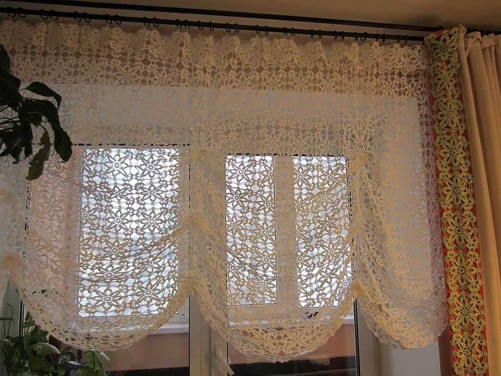 Для этого нужно связать детали будущей занавески, которые по размеру будут напоминать салфетки, а затем готовые элементы сшивают вместе, получая полотно нужного размера. Кайму таких гардин дополнительно обвязывают крючком по желанию