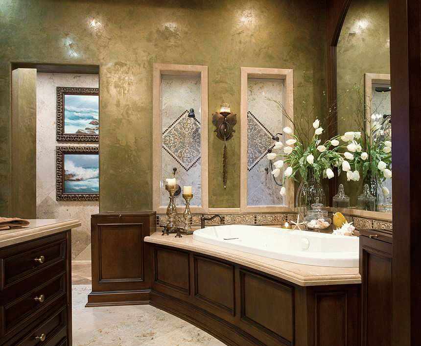 В числе первых – «венецианка». Ее нанесение позволяет получать идеально ровную поверхность, имеющую глянцевый или перламутровый перелив. В составе присутствует восковой компонент, который отталкивает влагу и не позволяет воде впитываться в структуру отделки. Такая декоративная штукатурка в санузле и в ванной комнате смотрится великолепно. Она идеально подходит для создания классических интерьеров, для украшения комнат, в которых присутствуют арочные своды, колонны, пилястры. Опытный мастер способен создавать при помощи такой штукатурки красивые фрески. Его работа, да и сам состав, стоит дорого, но результат того стоит. Выбор такого состава оправдан, если нужно поддержать высокий статус хозяев жилья.