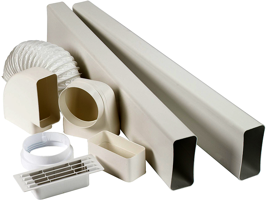 Кухни частных домостроений и квартир имеют различную планировку, которая подчас серьезно усложняет монтаж вентиляционной системы. В таких ситуациях нельзя обойтись без специальных элементов. Традиционно вентиляционные каналы представляют собой прямые части круглой или прямоугольной (квадратной) формы. Длина данных изделий – 35, 50, 100, 150 и 200 мм. При необходимости, используя ножовку, можно отпилить отрезок нужного размера. Когда возникает потребность в длине более 200 мм, монтируется элемент из нескольких стандартных изделий посредством соединителя для пластика. Соединитель располагается так, что за его счет общая длина не увеличивается.