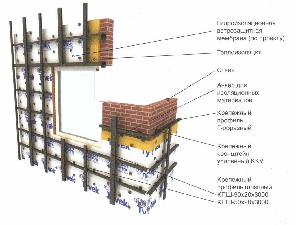 Деревянные – в таких каркасах применяют брус 50X60 и рейку 20X40 мм. Использование деревянных каркасов возможно только в случае небольшой массы фасада, кроме того, все деревянные элементы нуждаются в защите антисептиком.