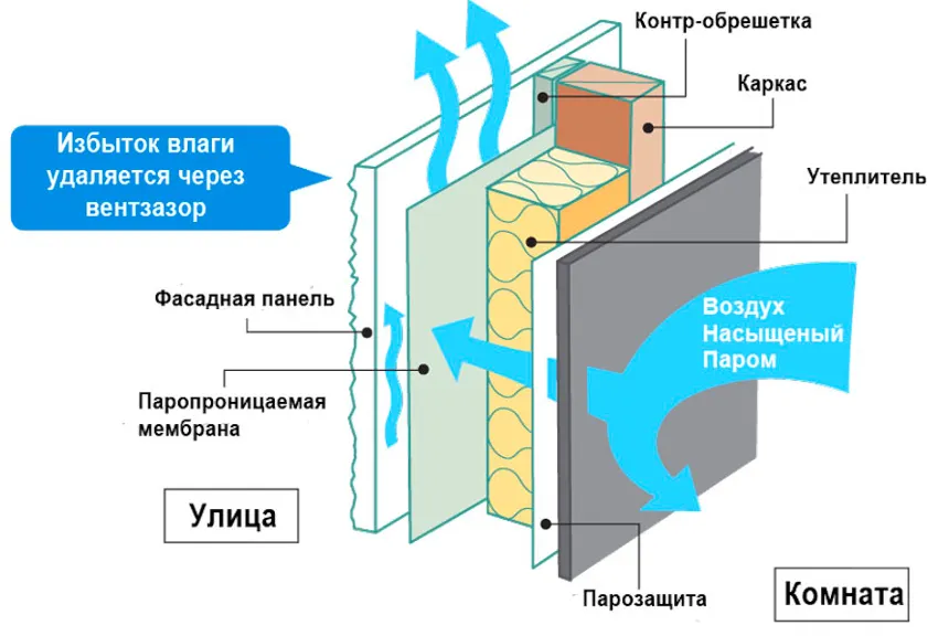- Вентиляционный промежуток. Именно он создает нужный эффект и защищает строение от скопления влаги и перепадов температуры.