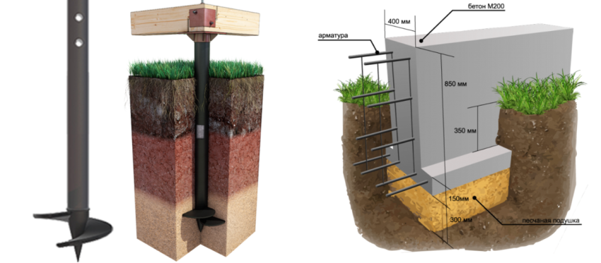 Если грунтовые воды подходят близко к поверхности, а уровень промерзания глубок, применяются свайный фундамент. Существует несколько вариантов технологии их установки – винтовой, забивной, заливной.