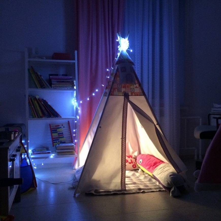 Если же к этническому стилю ни вы, ни ваш ребенок не склонны – попробуйте украсить шалаш гирляндой. Она создаст лучшую атмосферу для отдыха, после тяжелого дня в детском садике!