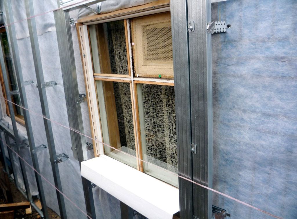 После того, как работы по утеплению фасада закончите, переходите на обрешетку под сайдинг. Она прикрепляется к предыдущим брускам, но в другом направлении. На оконные и дверные проемы прибивается окантовка.