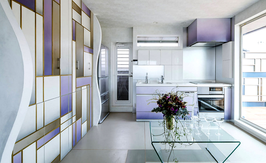 Чтобы оживить белую кухню и сделать ее более интересной, можно расставить цветовые акценты, используя фиолетовые, оранжевые и даже розовые цвета.