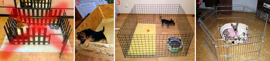 Когда щенок в манеже начнет вставать, опираясь передними лапами о бортик (поз. 2 на рис.), мягкую обивку нужно убрать и начать приучать щенка к квартирному вольеру из сетки, поз. 3; его лучше просто согнуть из отрезка сетки с ячеей от 3х3 до 5х5 см, пропаяв стык. Вязаный стык щенку травмоопасен.