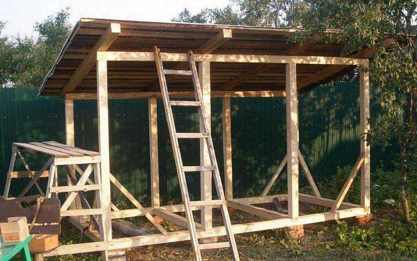 - Четыре угловых стойки. Если вы хотите сделать односкатную крышу, стандартную для таких построек, то передние столбики должны быть выше задних. Достаточно разницы в 20–30 см.