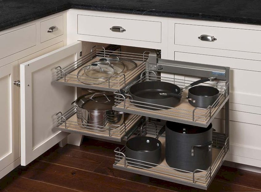 Корзины, размещенные внизу внутри пространства шкафа, выезжающие по направляющим, можно наполнить более тяжелой посудой, кухонными приборами крупных размеров. На полки карусельного типа можно поместить круглые предметы: кастрюльки, банки. Если уголок комбинированного типа, то возможно заполнение секций как сковородками, так и досками, коробками с бытовой техникой. В целом наполнение шкафчика зависит от производителя, типа конструкции и размеров мебели. В магазинах встречаются полки с ограждающим бортом, корзины проволочные, сетки для мелочей с мелкими ячейками.