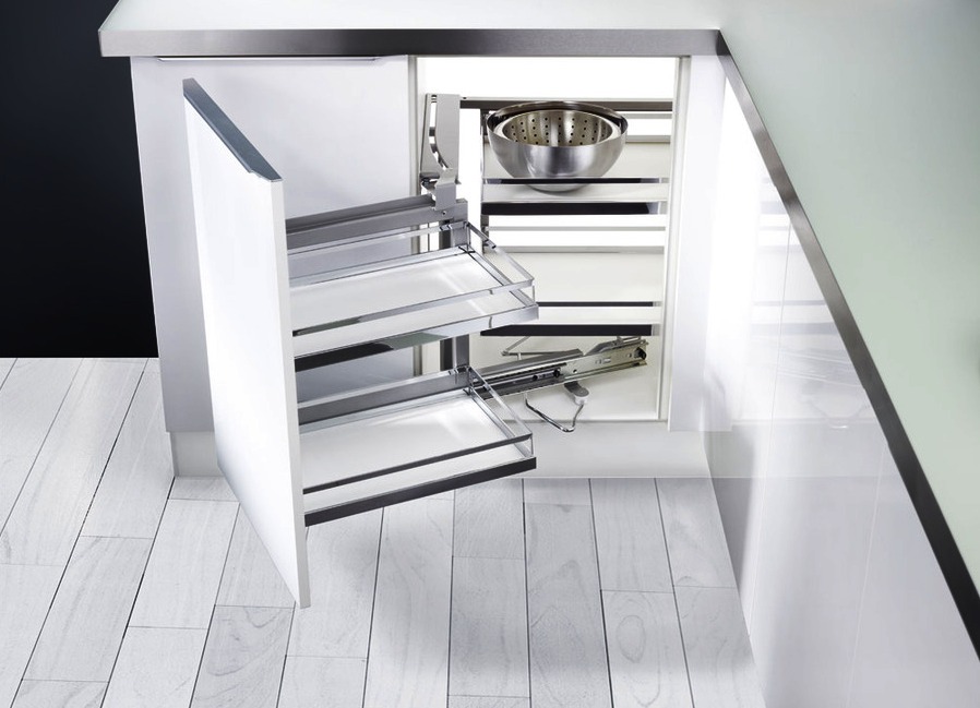 Приятный бонус: большинство выкатных уголков комплектуется доводчиками, обеспечивающими легкое и почти бесшумное закрывание дверей. За декоративность отвечает хромированное покрытие, которое к тому же оберегает металлические элементы от коррозии. Такая фурнитура полностью отвечает трем основным требованиям кухни: функциональность, долговечность и красота.
