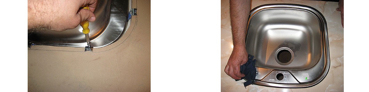 После финальной установки мойки лишний герметик удаляют, а саму мойку аккуратно вжимают в столешницу. Если в каком-то месте она плохо соприкасается, на это место на время кладут что-либо утяжеляющее.