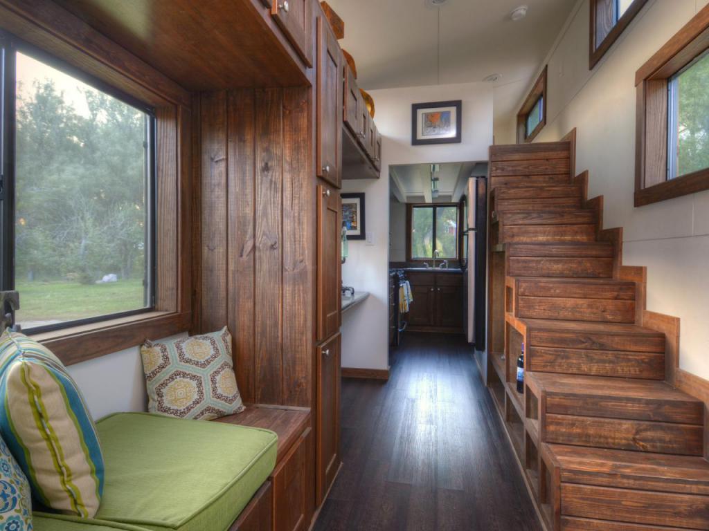 Первый этаж отведен под гостиную и кухню, а спальни находятся на втором этаже. Для отделки используется защитный лак, отбеливатель для дерева или штукатурка натуральных оттенков.