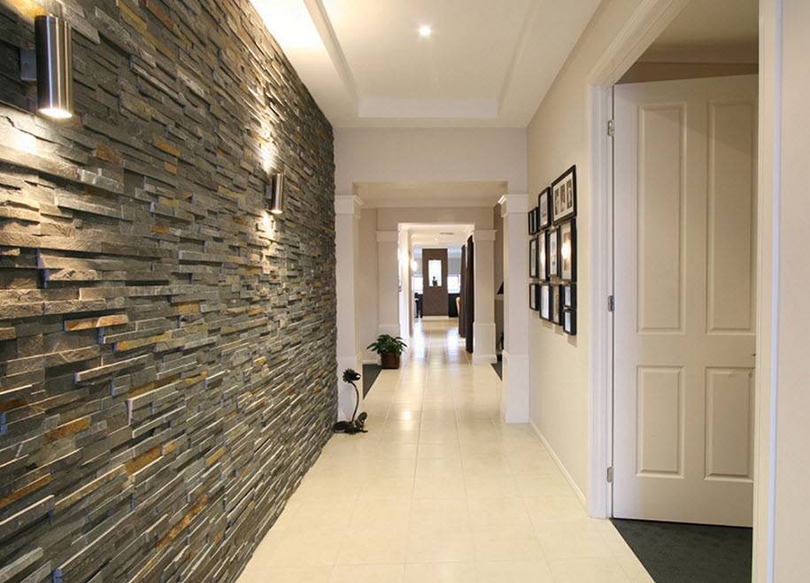 Декоративный камень на стене — это решение, которое часто используется в современном дизайне прихожей. Интересной идеей также является их сочетание с терракотой на полу. Залог успеха в этом случае — правильное сочетание цветов. Темный декоративный камень в коридоре будет отлично смотреться, если использовать один оттенок как для пола, так и для стен. Такое сочетание хорошо смотрится в просторных интерьерах — узкая прихожая с черным или темно-серым декоративным камнем может выглядеть даже меньше, чем есть на самом деле.