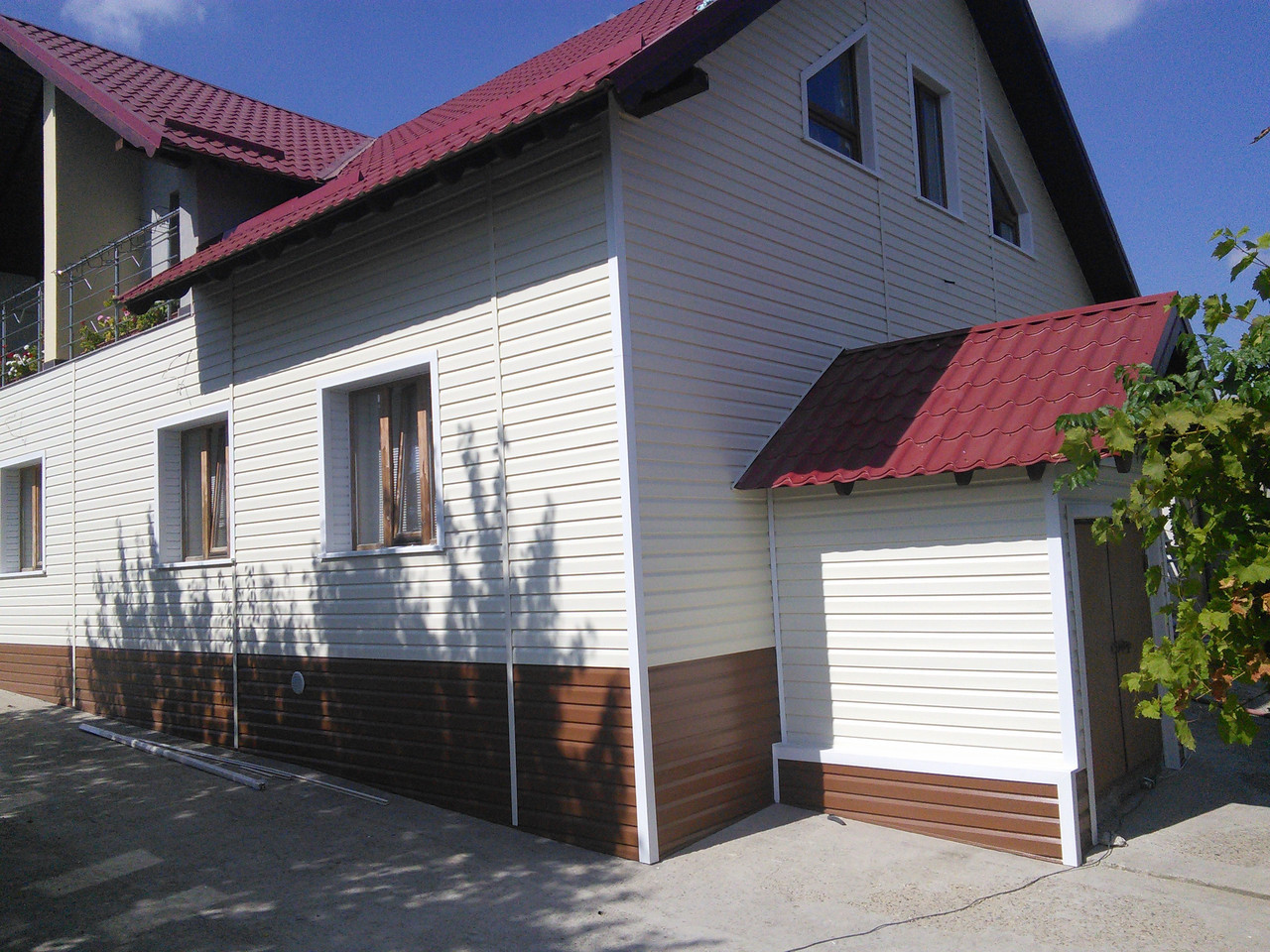 Светлые стены и темная крыша – классическое решение для такого случая. Например, сайдинг к красной крыше лучшего всего подойдет белый или светло-серый, а вот к шоколадной нужно подбирать тон с учетом теплой гаммы – прекрасно подойдет кремовый и светло-голубой