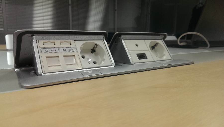 Если нужно подключить какой-нибудь бытовой прибор, встроенные розетки легко достаются из своих укрытий, а потом также легко убираются обратно, как на фото ниже.