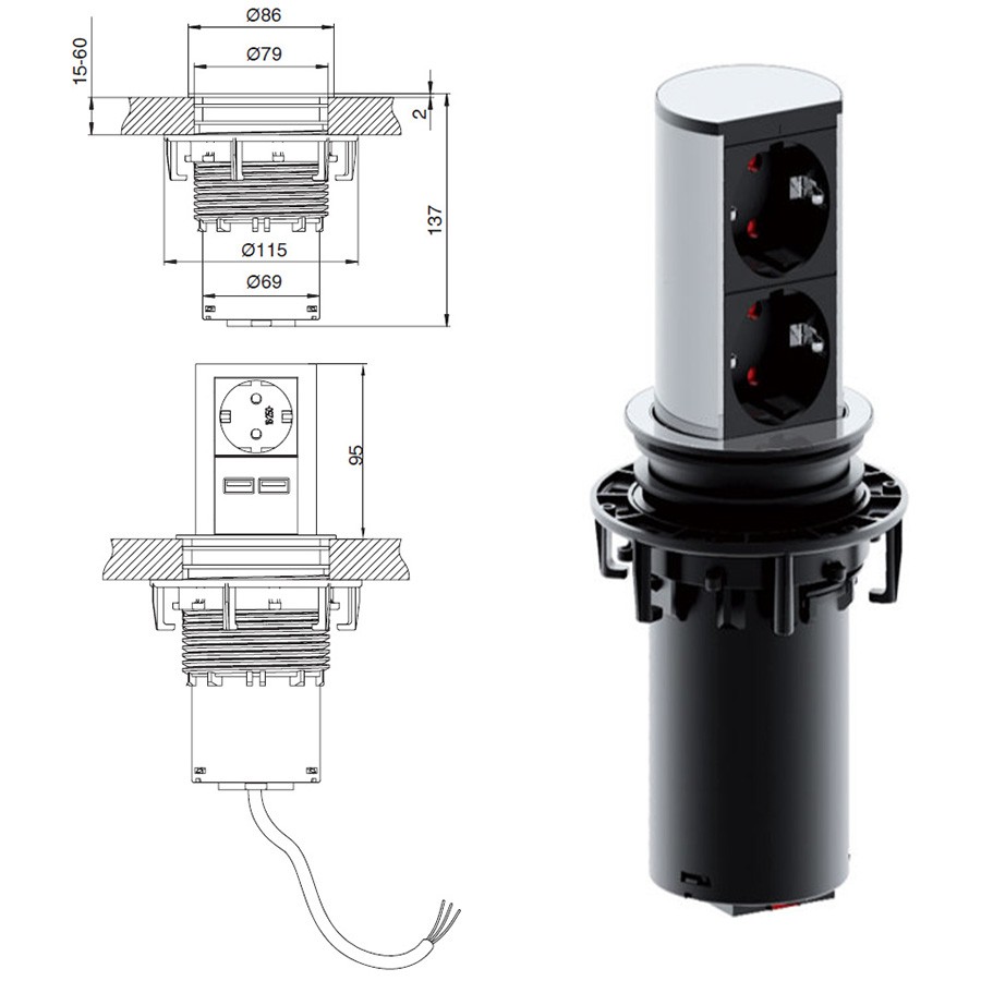 Чаще всего выдвижные розетки универсальны, т.е. их можно монтировать не только в столешницу, но и в подвесные шкафы.
