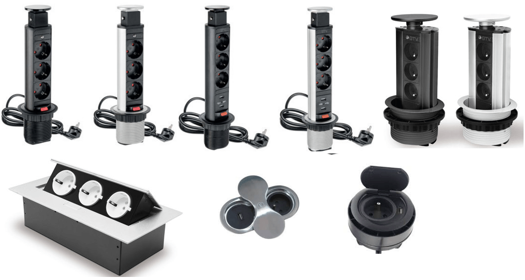 Конструкция. Некоторые модели можно утапливать в столешницу, не вынимая из них вилок электроприборов. Они наиболее практичны.