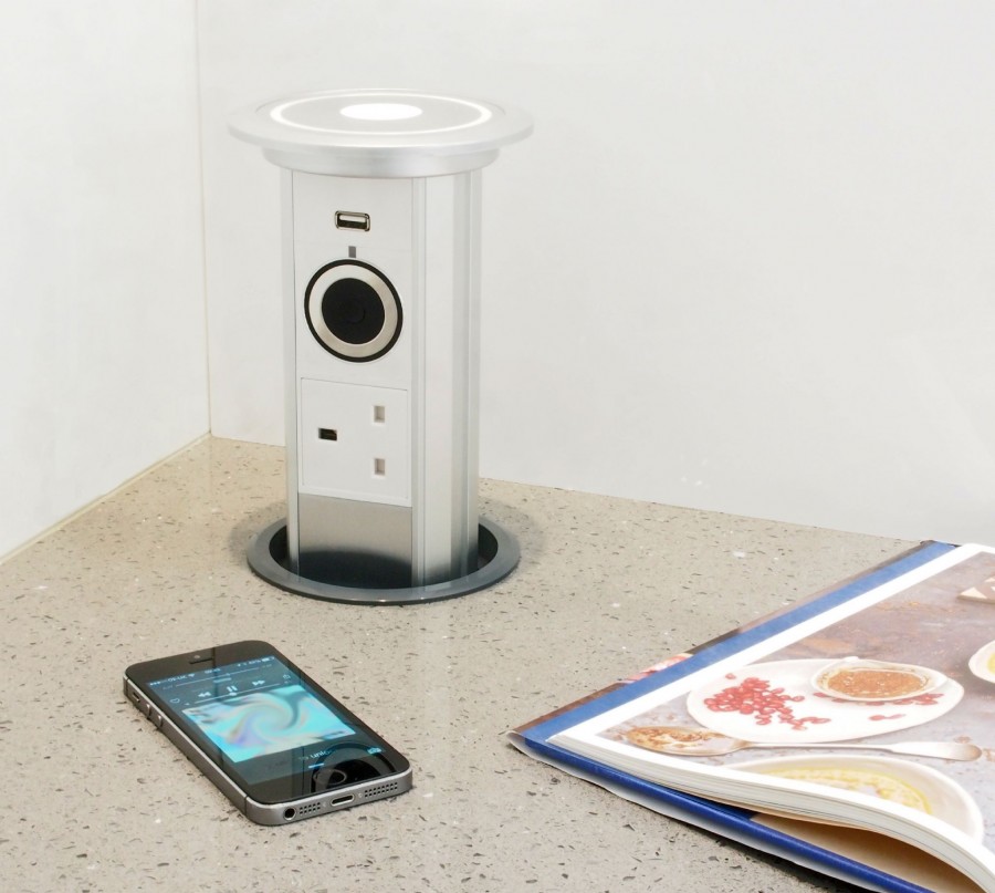 Вертикальная выдвижная кухонная розетка. Она поднимается из столешницы, как столбик, благодаря чему даже во время работы конструкция занимает минимум места. В закрытом виде представляет собой круглую крышку диаметром 6–10 см. Блок выдвигается после нажатия на верхнюю часть. Многие конструкции поворачиваются вокруг своей оси.
