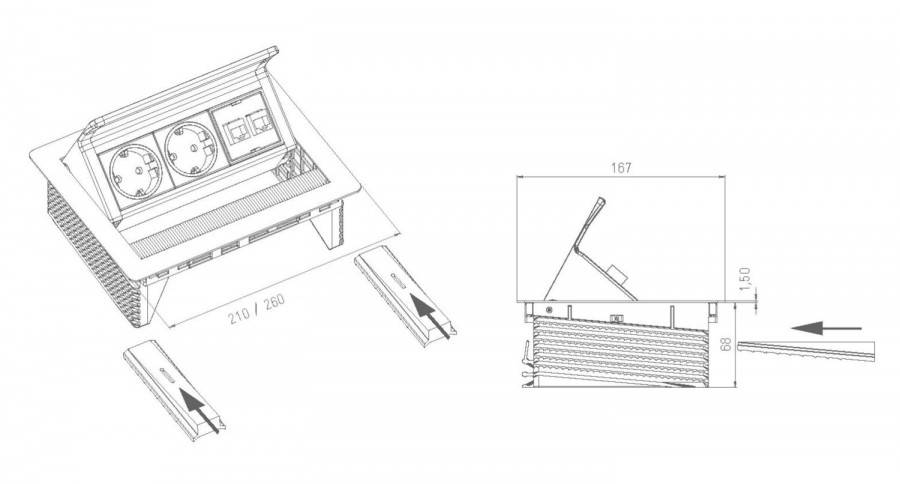 - Выдвижной розеточный блок располагается таким образом, чтобы его было легко открывать и закрывать.