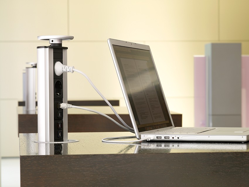 Стандартная ситуация: над столом имеется пара розеток и пользователь при необходимости увешивает их тройниками или удлинителями. Тогда о дизайне вообще не приходится говорить. Более правильное решение — подключить к этим розеткам встраиваемые розеточные блоки.