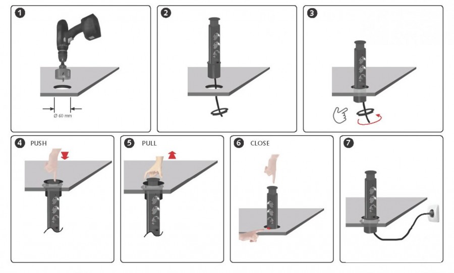 - Столешница при установке в нее такой розетки должна быть толщиной 30-50 мм.