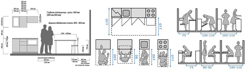 В результате разработок в области эргономики принято ориентировать стандартные параметры рабочего пространства кухни на средний рост человека.