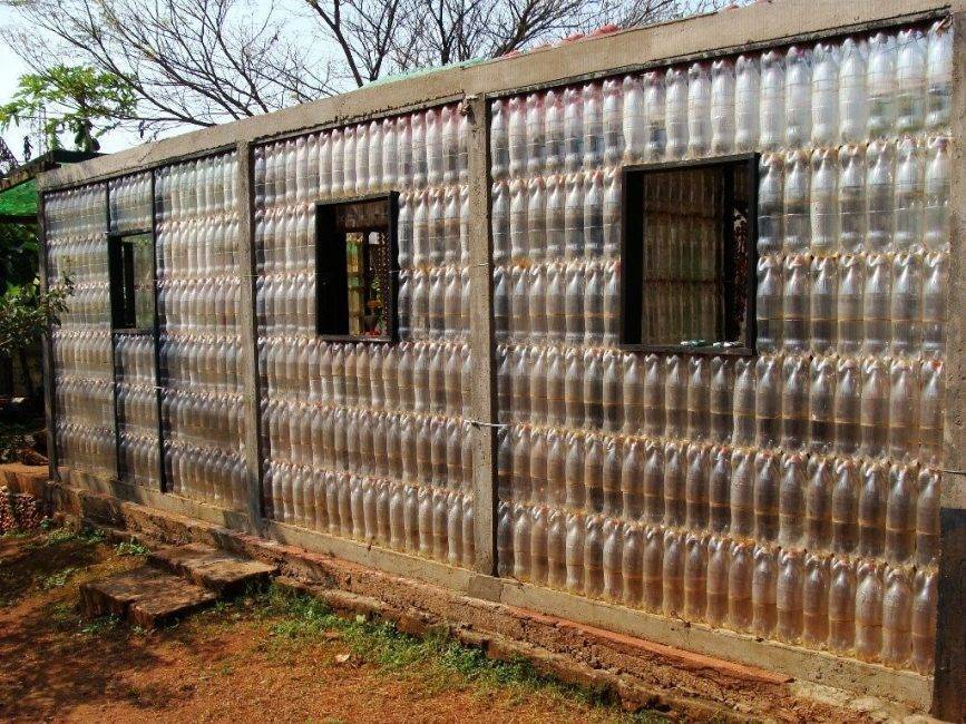 - Из бутылок можно выложить забор по типу кирпичного. Для утяжеления внутрь насыпается песок. Соединяются они цементной смесью.