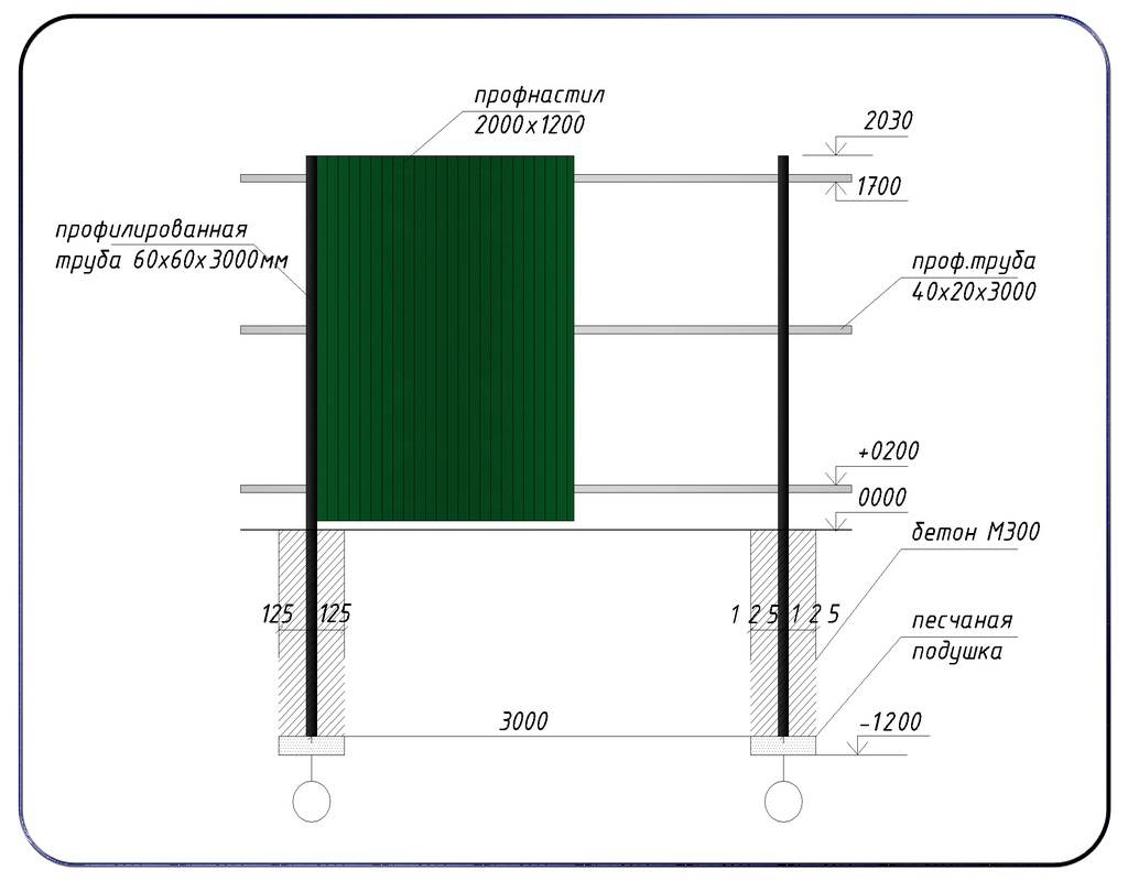 В качестве столбов устанавливаются трубы сечением 60х60, 60х40, 50х50 мм, на которые наваривается 2 ряда поперечных лаг из труб меньшего сечения (при высоте ограждения 2 м). Шаг между столбами принимается 2÷3 м, а расстояние между лагами — 120÷135 см. Профлисты монтируются с помощью саморезов.