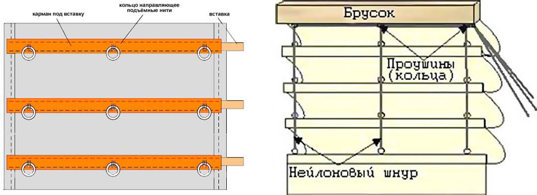 При желании верхний конец можно укрепить планкой, предусмотреть не только две концевые нити, но и третью натяжную, потянув за которую можно поднять штору. Тогда дополнительно потребуется блок – например, гладкое пластиковое или деревянное колечко, закреплённое на планке, через которое будет скользить нить.