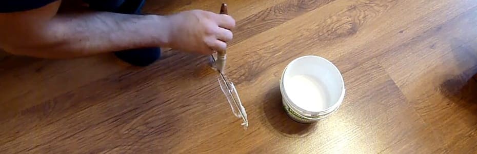 - Процесс нанесения мастики на ламинат является кропотливым занятием. Поэтому, чтобы немного упростить задачу, старайтесь покупать средства с более густой консистенцией. В этом случае удастся избежать быстрого растекания мастики по обрабатываемой поверхности.