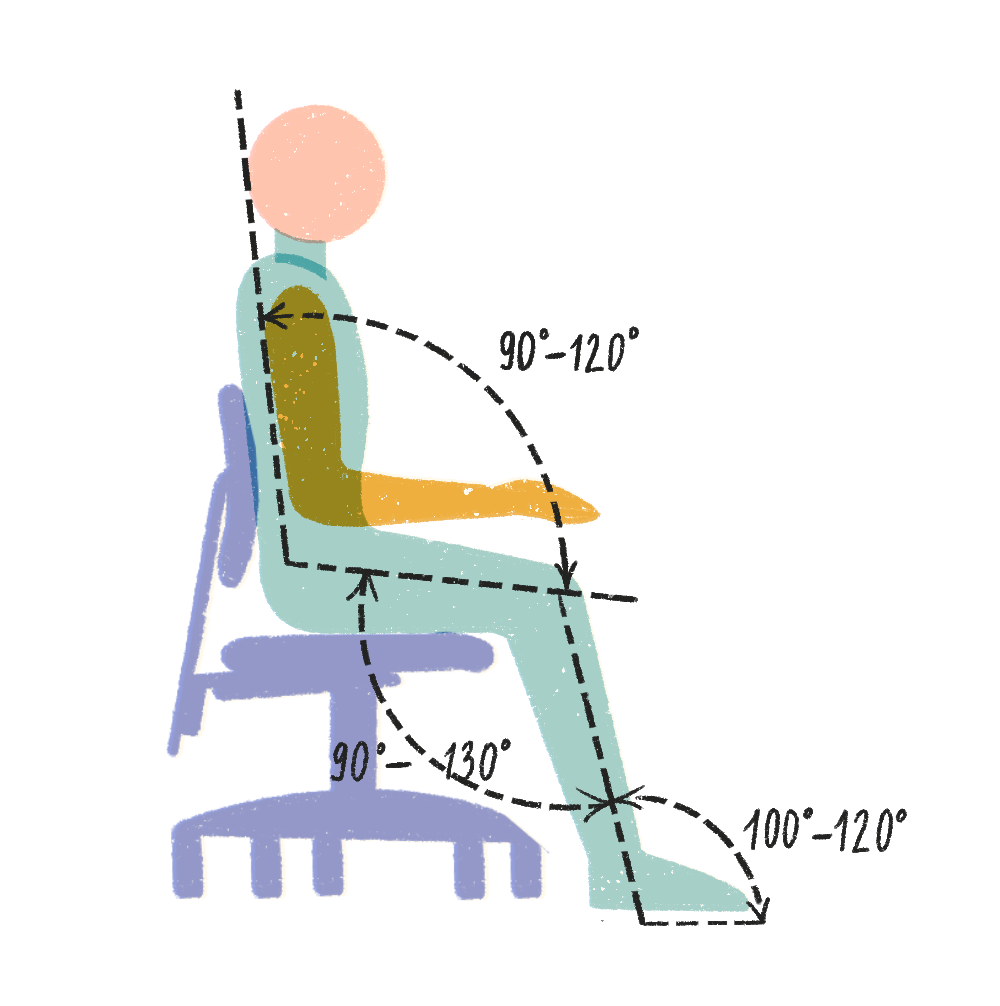 Не существует универсального положения тела, которое рекомендуется для сидения. Каждый работник может удобно сидеть, регулируя угол наклона бёдер, колен, голеностопных суставов и локтей. Ниже приведены общие рекомендации. Случайные изменения за пределами заданных диапазонов допустимы, а иногда и полезны.