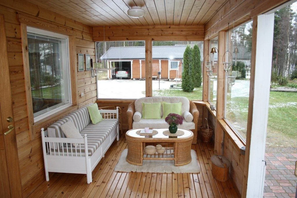 Для него применяются двухкамерные теплосберегающие стеклопакеты. Это позволит устроить на веранде зимний сад либо уютный уголок с камином
