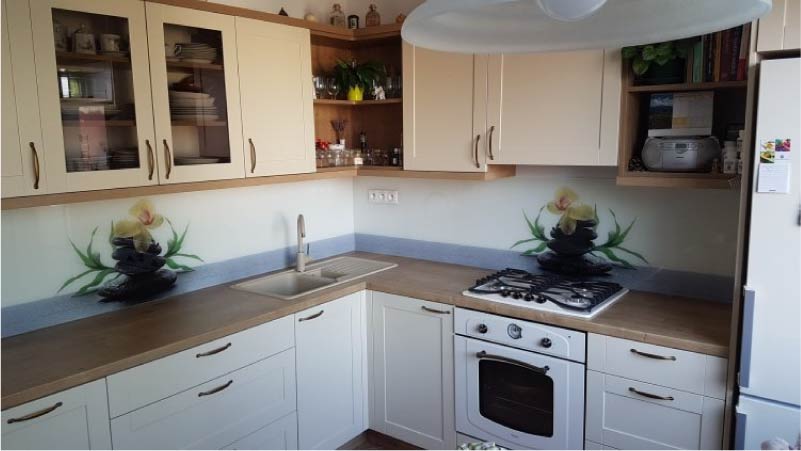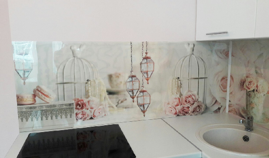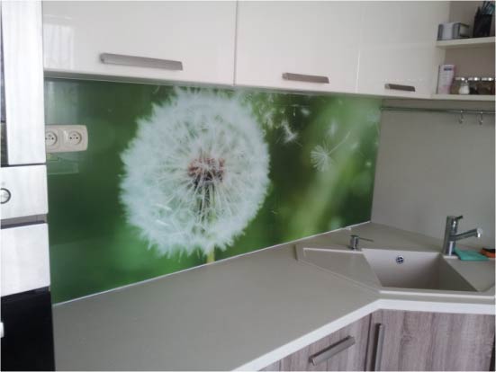 Стекло используется для отделки кухонных фартуков не так давно, а зря. Это прекрасный материал, который отвечает всем требованиям, выдвигаемым к данной зоне. Стеклянные панели с нанесенным на них рисунком называют также . Их изготавливают из толстого закаленного стекла и декорируют различным образом: методом пескоструйного матирования, размещения внутри 3D поликарбонатного материала или же с помощью ультрафиолетовой печати. Пескоструйная обработка