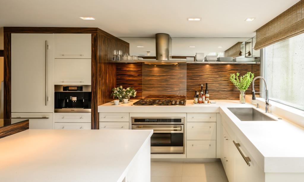 Особого внимания при разработке дизайна требует угловая кухня. Если оттенок мебели достаточно темный, следует организовать яркую подсветку рабочей зоны. Скинали рядом с угловыми гарнитурами ставят так, чтобы узор был завершенным при взгляде на каждую из частей.