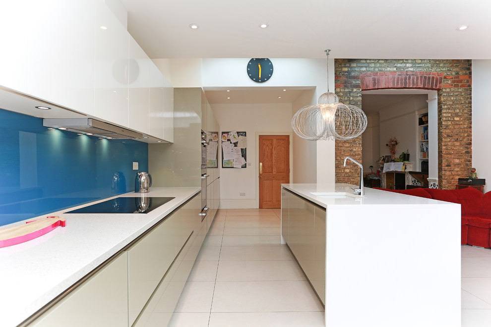 Если фасады мебели глянцевые, то для стен хорошо подобрать теплые оттенки белого: кремовый, бежевый, молочный.