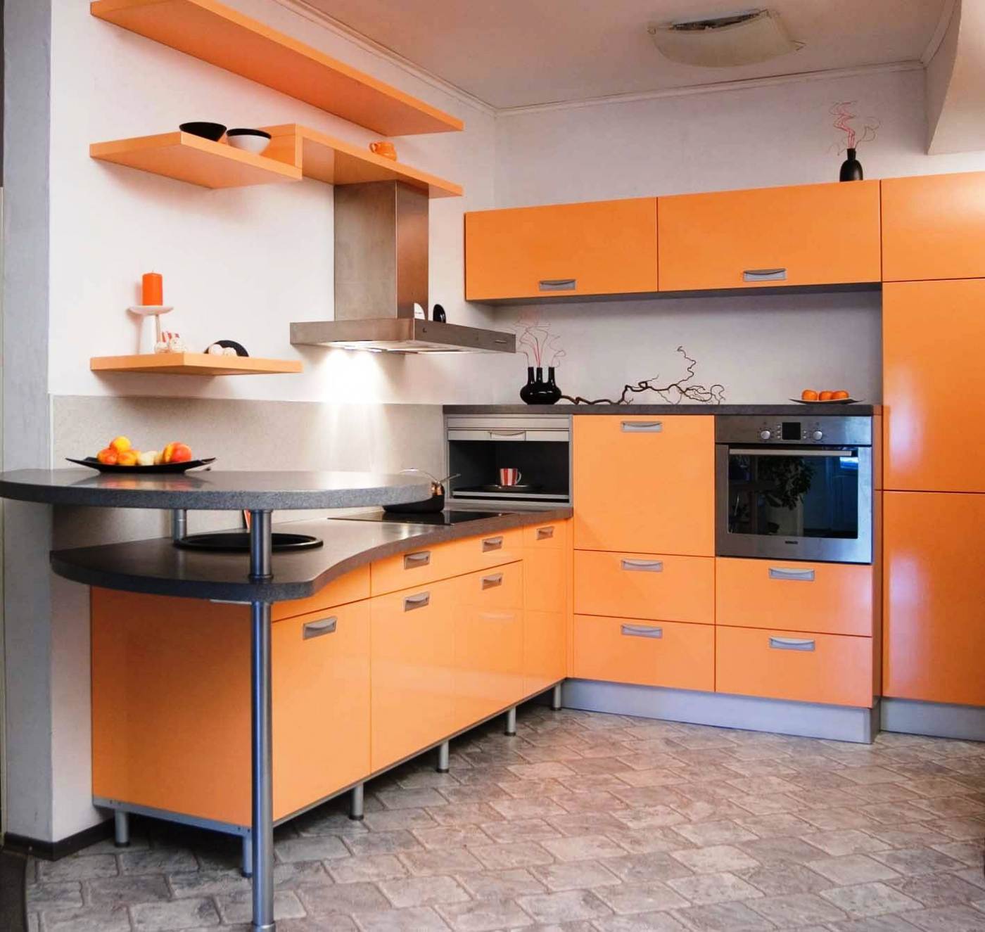 Заряд энергии позволит получить оранжево-зеленая кухня. Она просто будет бить ключом энергии, радовать красками, цветом, она также повысит настроение и аппетит. В качестве фона лучше всего выбрать белый или бежевый цвет.