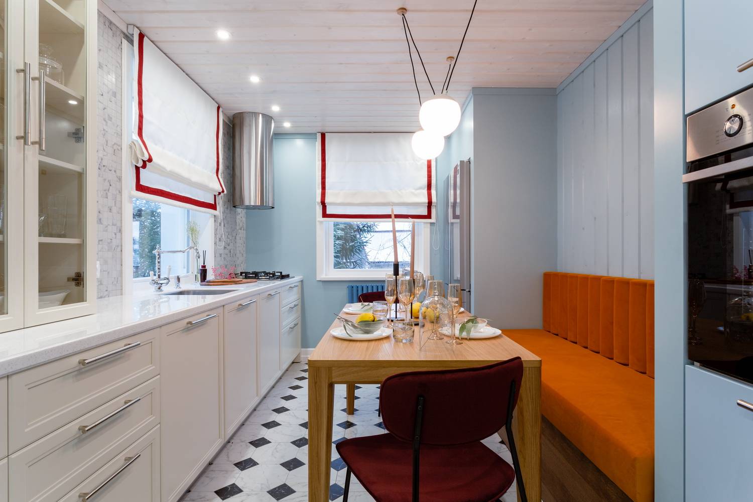 Самое классическое сочетание из всех. Испортить невозможно, единственным минусом может быть некоторое однообразие, которого легко избежать, используя шахматное оформление гарнитура или контрастные акценты.