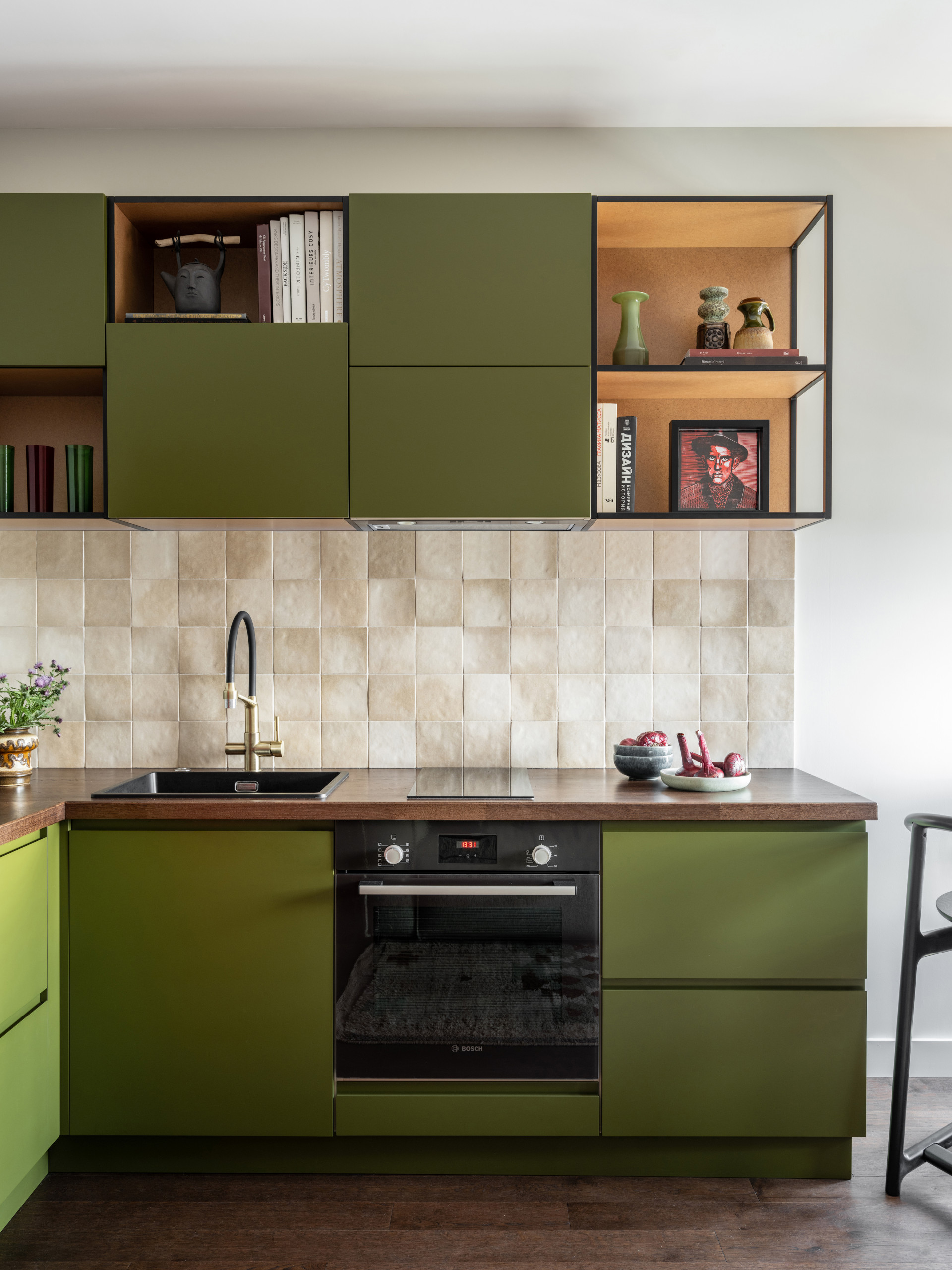 Зеленый — один из лучших цветов для оформления кухни. Он активный, но не агрессивный, помогает создать благоприятный психологический фон, хорошо принимает разнообразные фактуры и различные материалов.