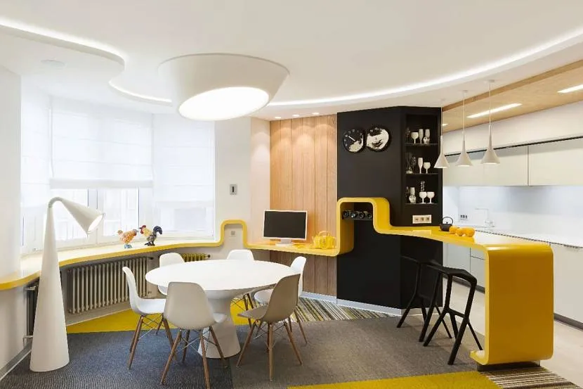 Можно сделать и яркий насыщенный интерьер, выбрав комбинацию желтого с черным и белым. Необходимый объем даст светлый фон, а желтый и черный, выступая акцентными цветами, придадут глубину и яркость.