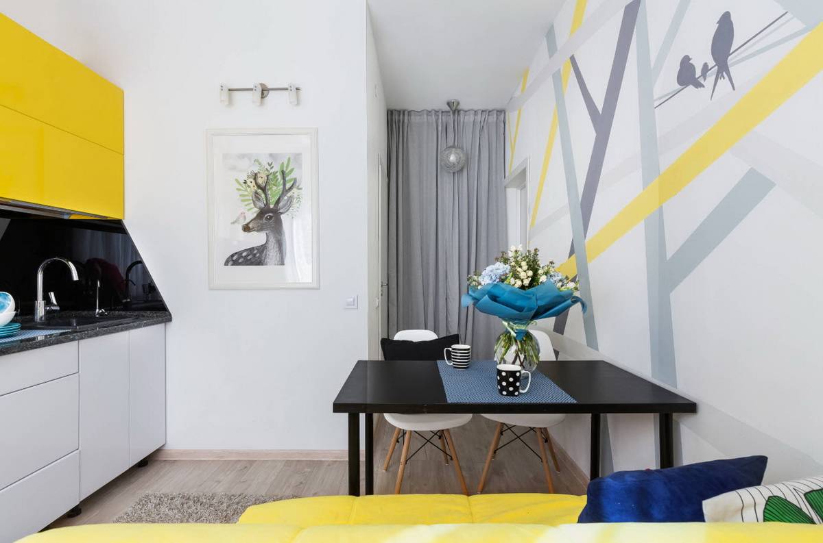 Желтые стулья, обеденный стол и кухонный гарнитур
