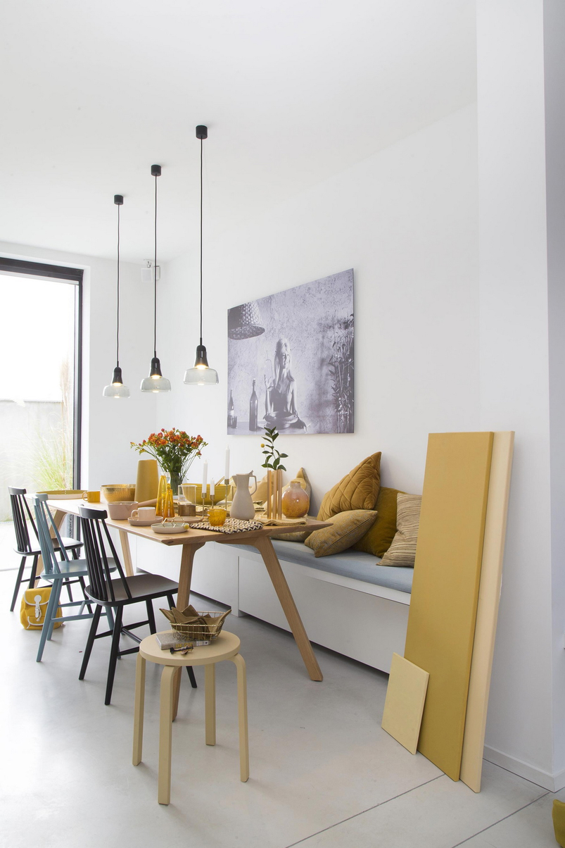 Нежные оттенки желтого будут хорошим фоном для отдельных акцентов. Вы даже можете включить в интерьер горчичный и карри.