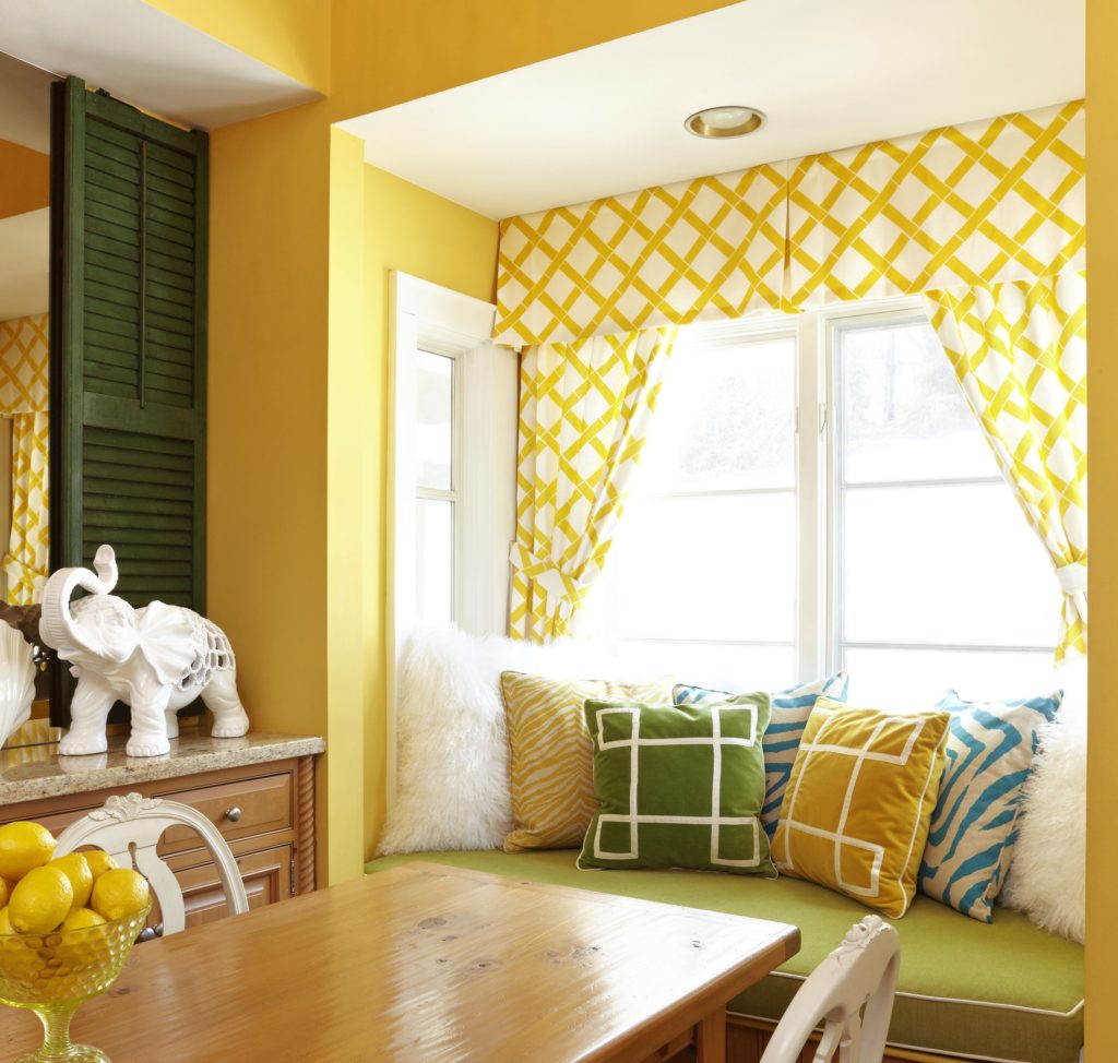 Желто-зеленые краски подарят энергию, бодрость. Такое сочетание всегда будет удачным, ведь используются сразу теплые и холодные тона. Если окна выходят на солнечную сторону, то смело применяйте холодные оттенки, если на север, то подойдет теплая палитра. Маленькая площадь помещения предполагает более светлые тона. Хорошо будет смотреться в интерьере мебель из дерева.