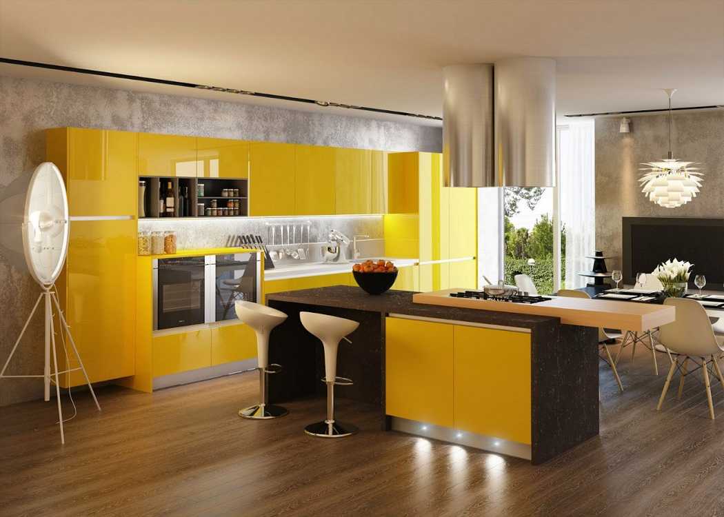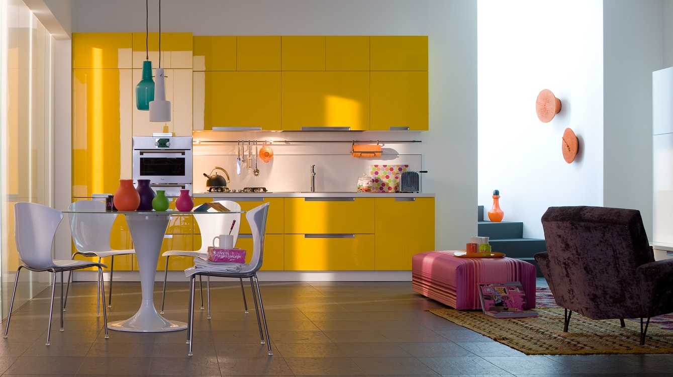 - возможность реализации любой дизайнерской концепции в кухне — жёлтый гармонично вписывается в большинство существующих стилей от классики до модерна и хай-тек.