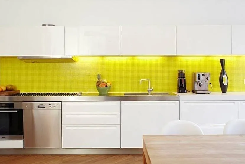 Лаймовые акценты в интерьере желто-зеленой кухни делают интерьер более гармоничным