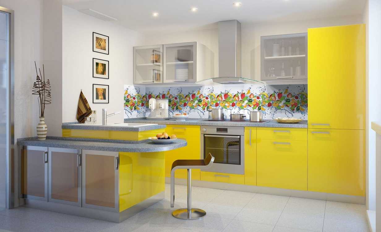 Желтым кухонным фасадам очень идет декор фотопечатью на стекле (скинали), особенно — изображения еды (фрукты, овощи, кофейные зерна), другой вариант — кухонный фартук в той же технике, несколько примеров — перед вами.