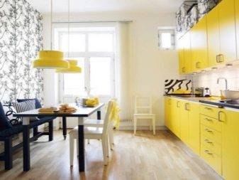 Кухонный гарнитур можно оформить в таком же или другом оттенке желтого, в том случае, когда акцент будет сделан на текстиль, пол, потолок или картины, развешанные на стене.