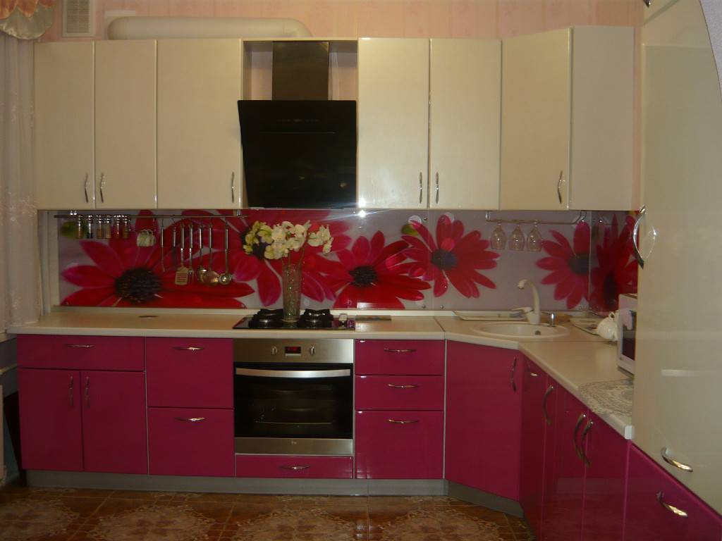 Сочетание гарнитура нейтрального цвета и розового фартука является стильным и ярким. Идеально использовать розовую, серую или черную мозаику, либо закаленное стекло с рисунком.